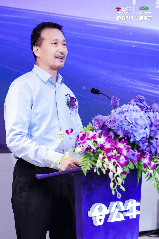 接下来,贾磊总经理详细解读了公牛小晴空大路灯旗舰款的核心技术优势,即将紫光芯片科技与650nm靶向红光科学创新性结合,打造紫红好搭档,科学护眼光配方。其中,紫光激发实现线蓝光危害,打造持续稳定的护眼好光;单波红光精准激活眼能量,抑制眼轴增长更养眼,紫红协同作用从源头缓解用眼疲劳。