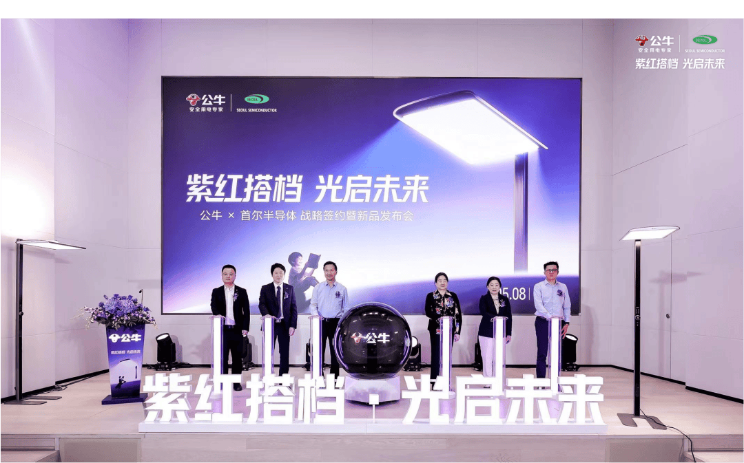 5月8日,公牛集团与全球LED巨头首尔半导体达成战略合作,正式发布行业首款搭载紫光激发+单波红光技术的公牛小晴空大路灯旗舰款。发布会以“紫红搭档 光启未来”为主题,以创新技术重新定义健康光环境,开启全屋健康照明时代。